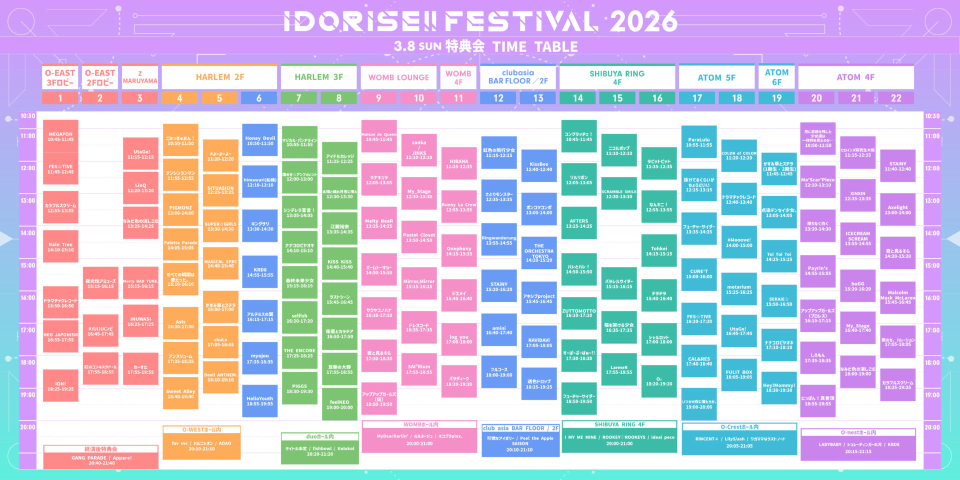 IDORISE!! FESTIVAL 2026 Spotify O-EAST / Spotify O-WEST / Spotify O-nest / Spotify O-Crest / duo MUSIC EXCHANGE / WOMBLIVE / clubasia / LOFT9 Shibuya / SHIBUYA RING