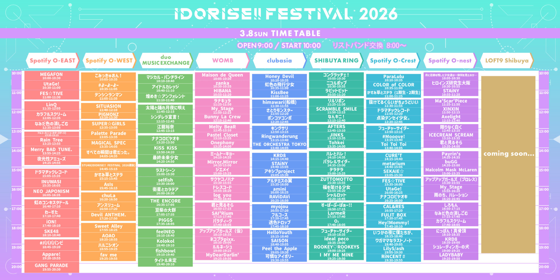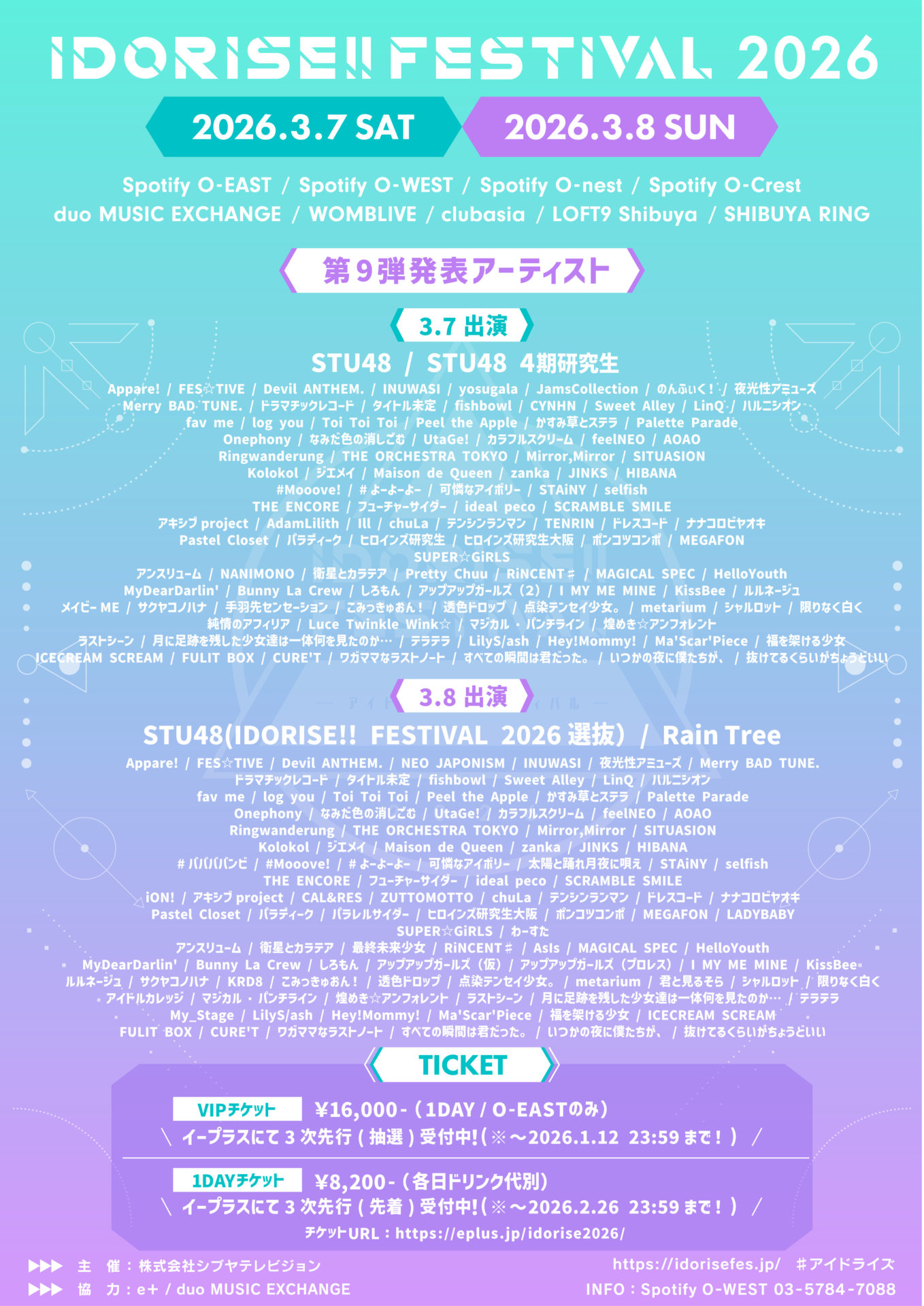 IDORISE!! FESTIVAL 2026 Spotify O-EAST / Spotify O-WEST / Spotify O-nest / Spotify O-Crest / duo MUSIC EXCHANGE / WOMBLIVE / clubasia / LOFT9 Shibuya / SHIBUYA RING